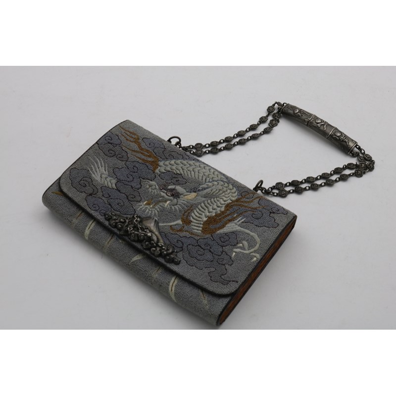 with a bamboo & chain-link handle, the bag and the clasp decorated with dragons, unmarked c.1900; 7.1" (18 cms) long