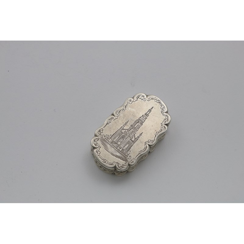 with a view of either the Albert or the Scott memorial on the cover, gilt interior, by Frederick Marsden, Birmingham 1862; 1.9" (4.7 cms) long; 0.75 oz