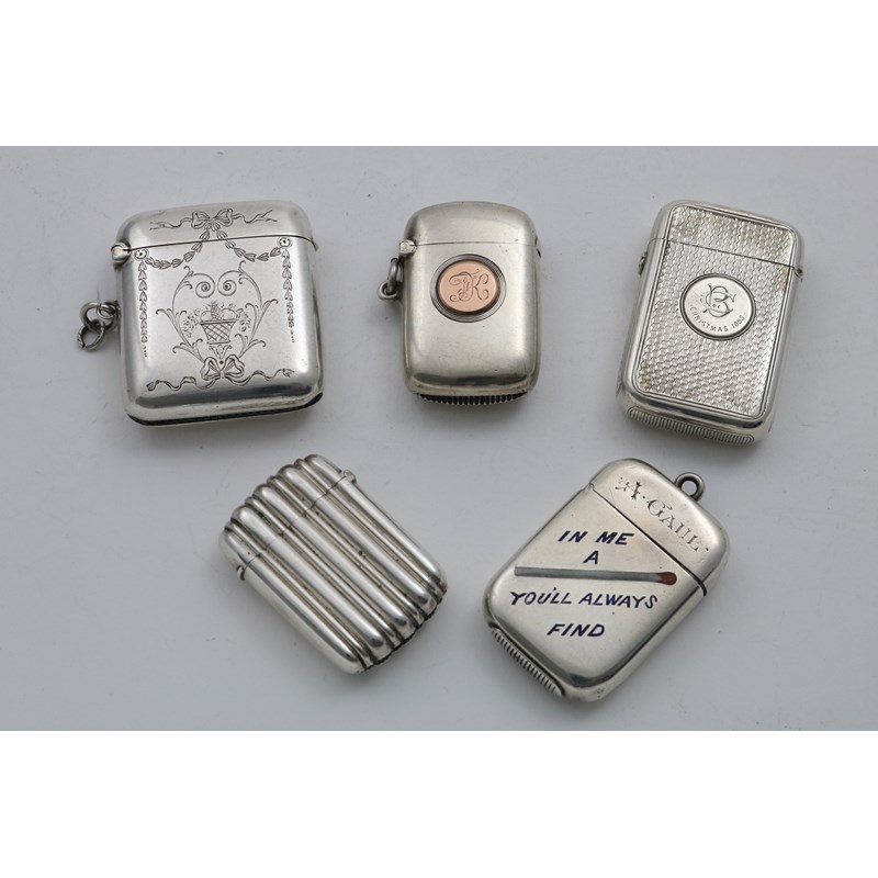 enamelled "IN ME A (MATCH) YOU'LL ALWAYS FIND" & inscribed, by Sampson Mordan, London 1886, a late Victorian fluted vesta case, an engraved vesta by Ollivant & Botsford, London 1911, an Edwardian vesta with a gold cartouche, initialled, by C. Saunders & F. Shepherd, London 1901 and an engine-turned vesta case, monogrammed and inscribed "Christmas 1868", by W. Wright & F. Davis, London 1868; the latter 2.25" (5.7 cms) long; 4.8 oz (5)