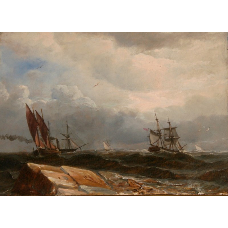 SAM BOUGH, RSA (1822-1878) VESSELS IN CHOPPY WATERS OFF A JETTY Signed, oil on panel, unframed 22 x 29.5cm.