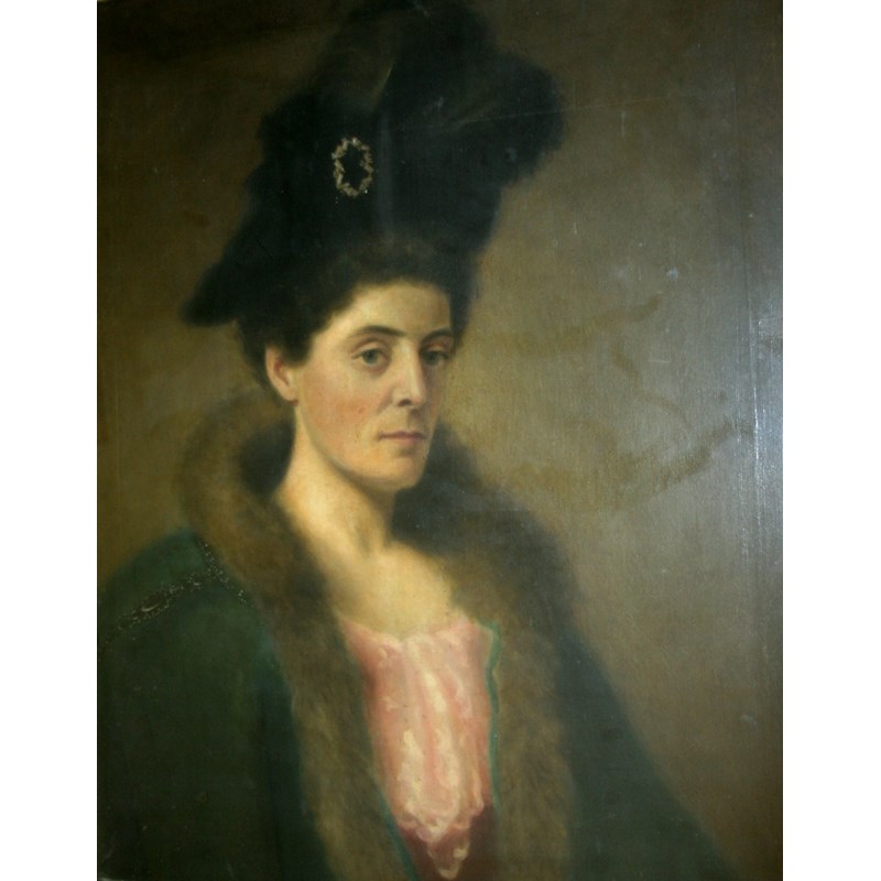Bust length, wearing a coral dress, a dark green coat with a fur collar and a black hat, oil on canvas, in a period gilt frame