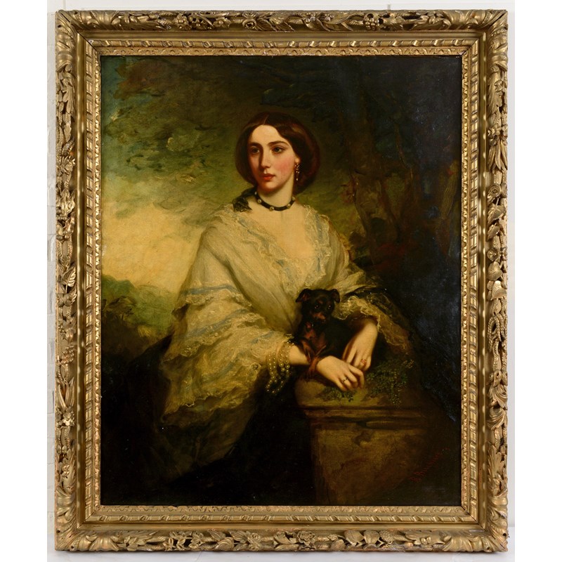 Standing long half length, wearing a chiffon dress and holding a miniature Pinscher, signed, oil on canvas, in a period gilt frame with pierced floral, leaf and berry decoration
