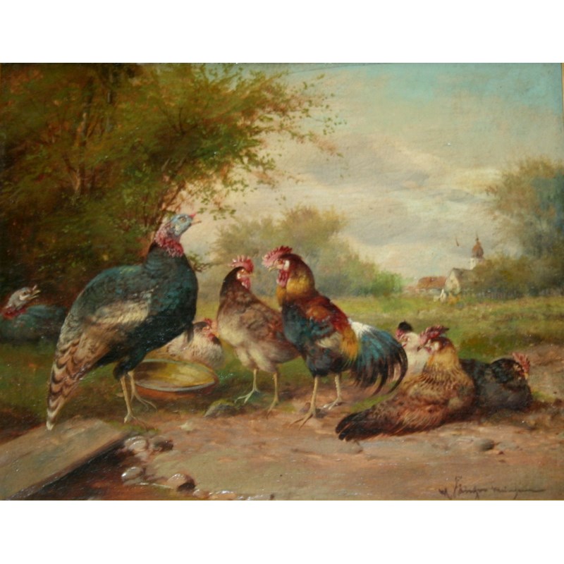 MAX I. HANGER (1874-1941) POULTRY MATTERS Signed and inscribed Munchen, oil on panel 20 x 25cm.