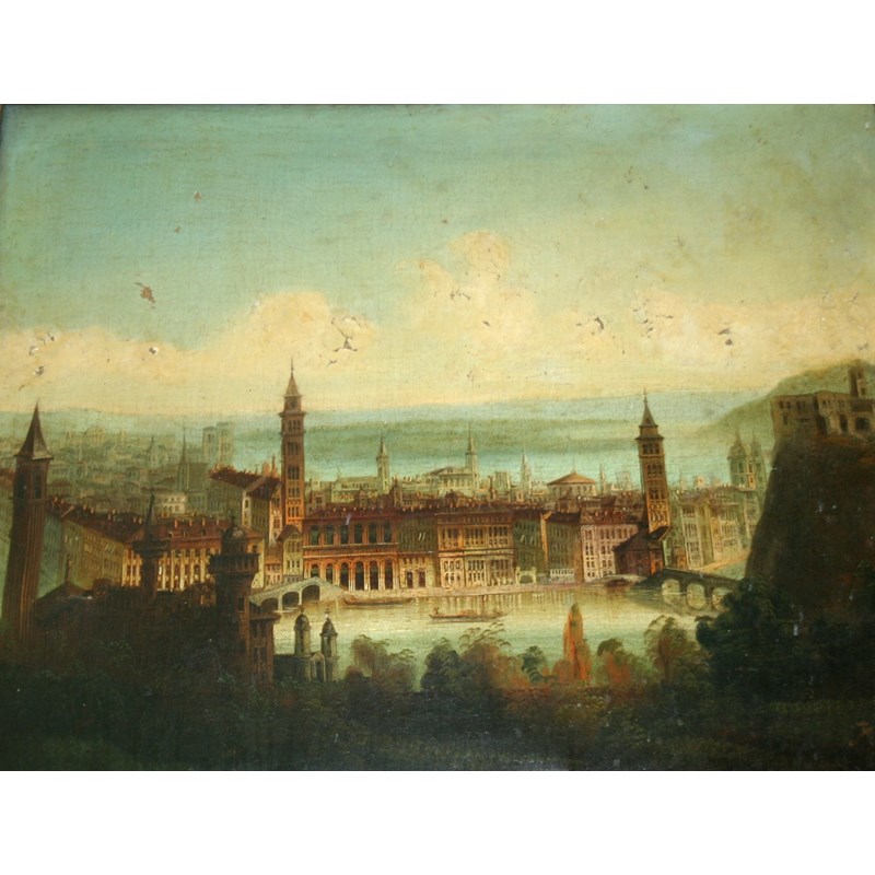 CIRCLE OF FELICE AUGUSTE REZIA (1857-1906) A TOWN ON A RIVER (VERONA?) Oil on canvas 54 x 67cm.