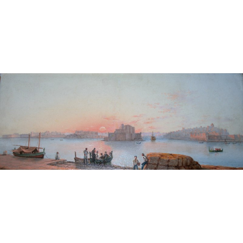 CIRCLE OF GIROLAMO GIANNI (1837-1895) GRAND HARBOUR, VALLETTA, MALTA (?) Oil on board 16.5 x 39.5cm.