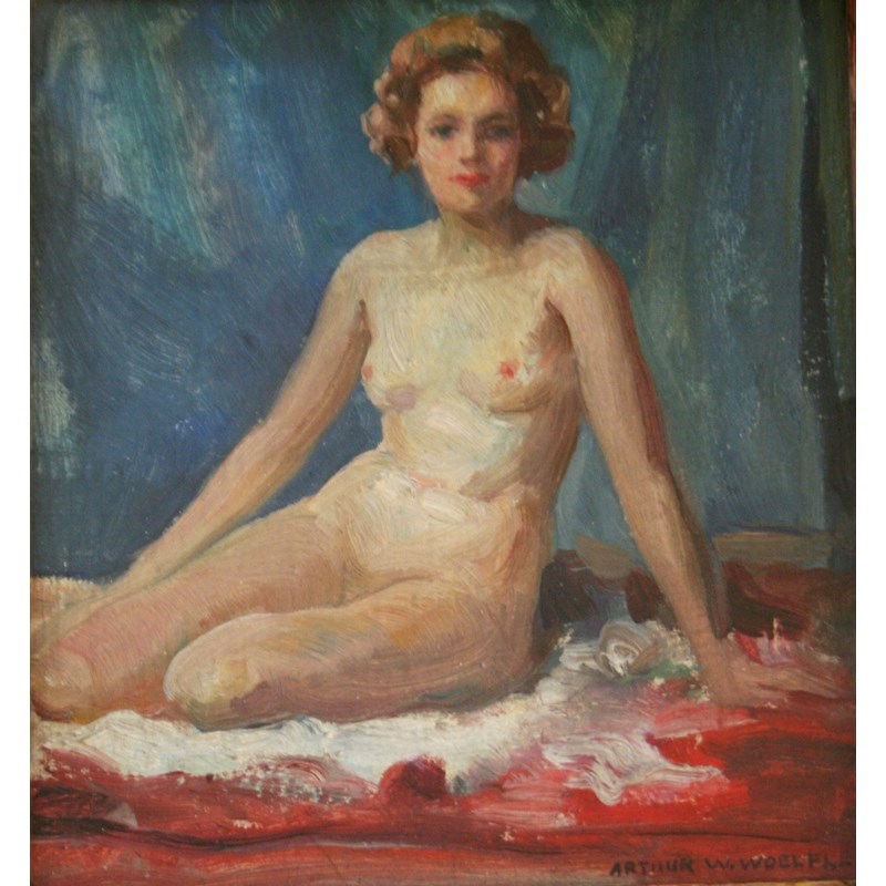 ARTHUR WILLIAM WOELFLE (American, 1873-1936) SEATED NUDE Signed, oil on canvas laid on board 24.5 x 22cm.