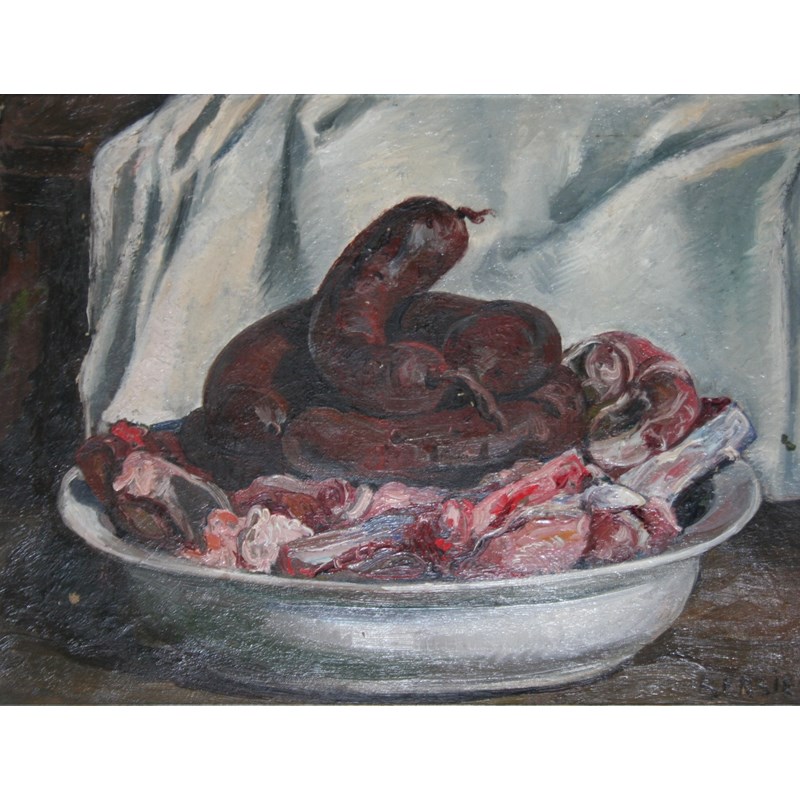 JEAN EUGENE BERSIER (1895-1978) UNE ASSIETTE DE BOUDINS NOIRS ET COTELETTES Signed, oil on canvas 31.5 x 40cm.