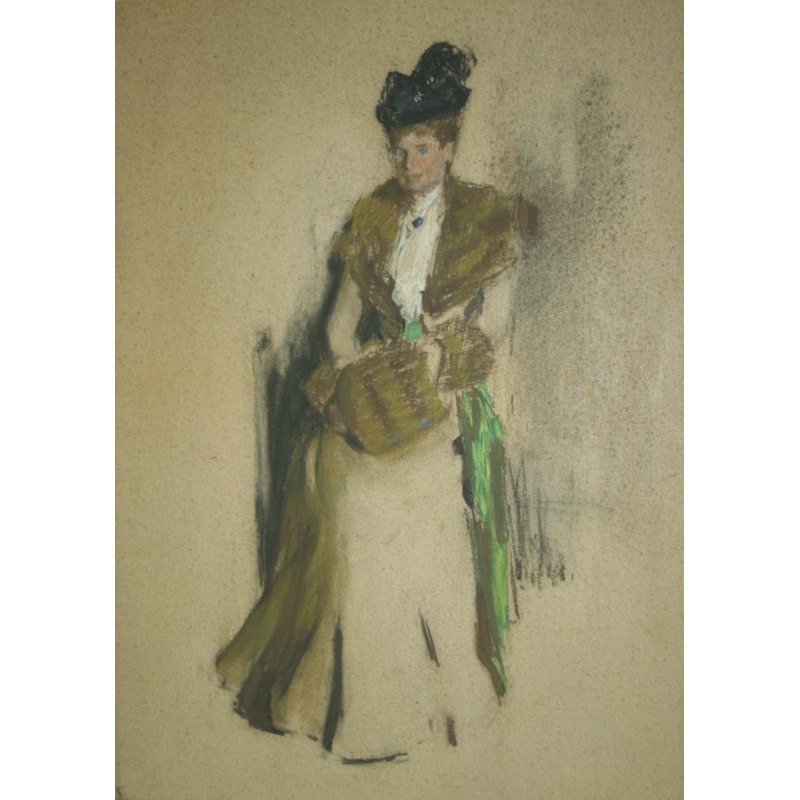CIRCLE OF SIR JAMES GUTHRIE, PRSA (1859-1930) PORTRAIT SKETCH OF A LADY Seated, wearing a fur-trimmed coat and muff, coloured pastels 64.5 x 46.5cm.