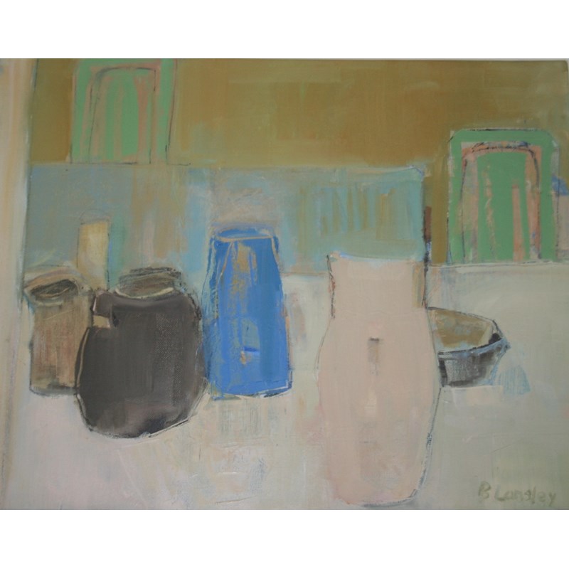 ‡BRIDGET LANSLEY (b.1950) STILL LIFE WITH GREEN CHAIRS Signed, oil on canvas 39 x 49cm.