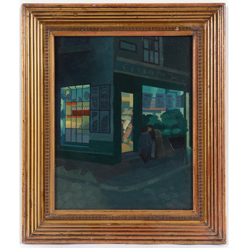 * Hay was Scottish by birth but studied at the Westminster School of Art (where he was awarded the King's Prize for Perspective). He also spent time at art schools in Camberwell and Chelsea and is recorded as living at 12 Lawrence Street in Chelsea in the 1920's. His only Royal Academy exhibit was an engraving in 1923 but the inky greens and purple tones of this atmospheric work link him stylistically with the Camden Town Group. Artists such as Spencer Gore, Robert Bevan and Charles Ginner drew inspiration from anecdotal but mundane urban incidents, executed with sensitivity for colour, mood and composition but without any strained grandeur. Hay's drawings show a fine eye for draughtsmanship which would have led him naturally towards printmaking in the boom era of the 1920's but his oils are very scarce at auction.