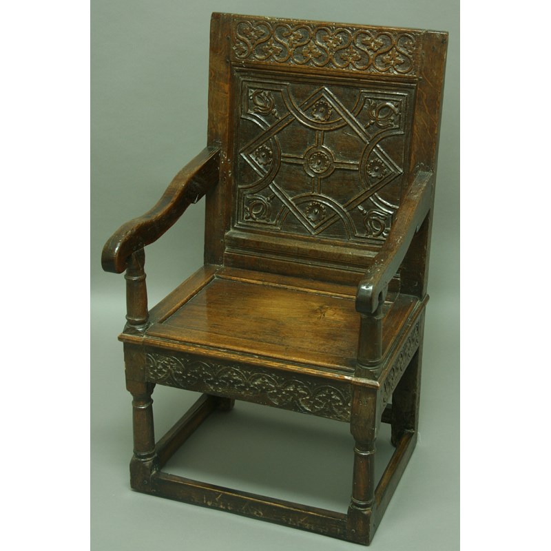 17th century and later, with 'S' carved top rail, geometric and flowerhead back panel, solid seat, downswept arms, lunette carved seat rail, turned legs and block stretchers, 98cm