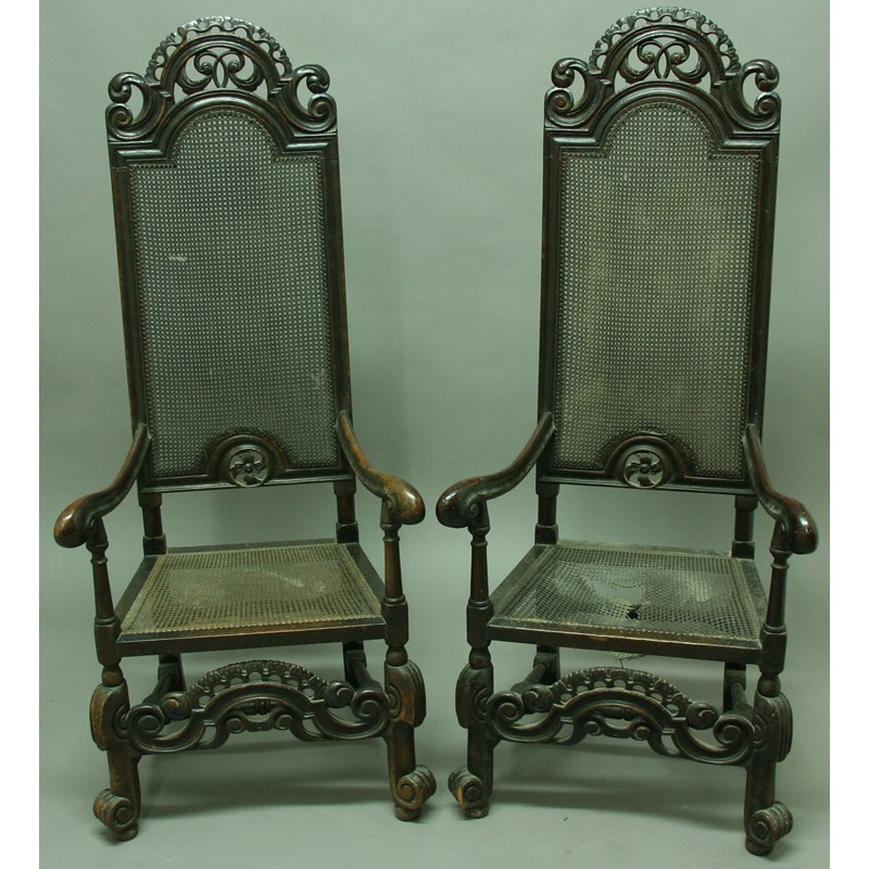 A PAIR OF CAROLEAN STYLE CHAIRS, probably 19th century, with pierced and carved top rail, caned seats outswept arms (2)