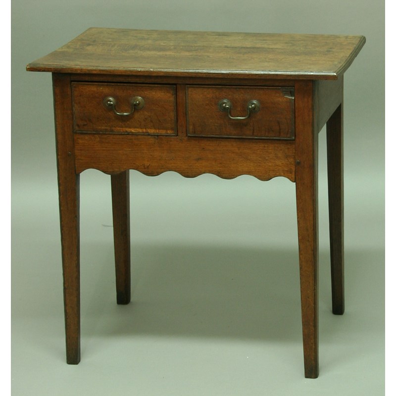 A GEORGE III OAK LOWBOY, late 18th century, the rectangular top above two frieze drawers, height 76cm, width 73cm