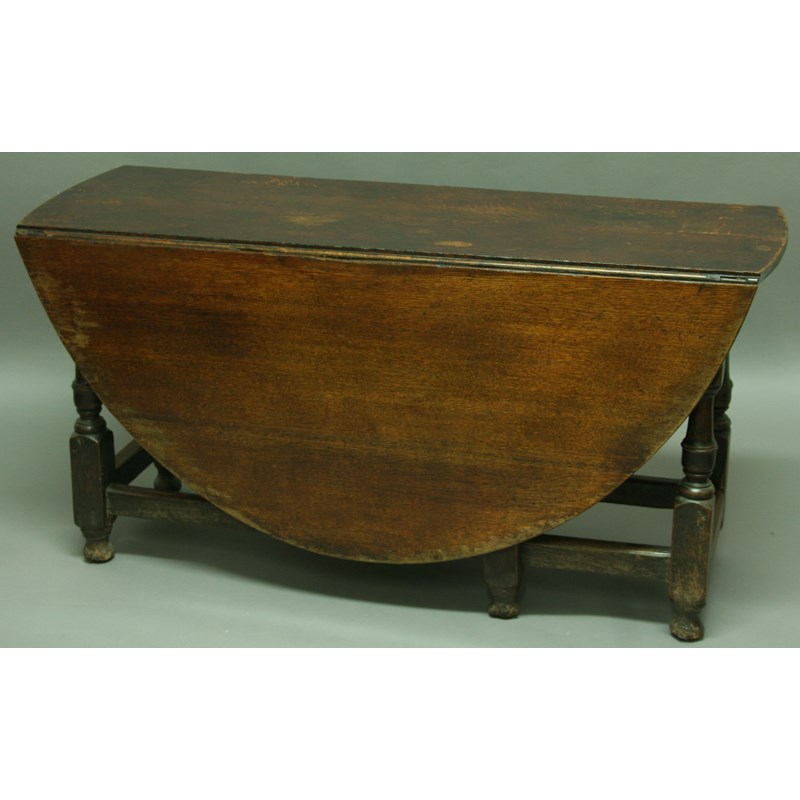 AN OAK GATELEG DINING TABLE, late 17th century and later, with oval top, single drawer, cannon turned and block legs and stretchers, 167cm