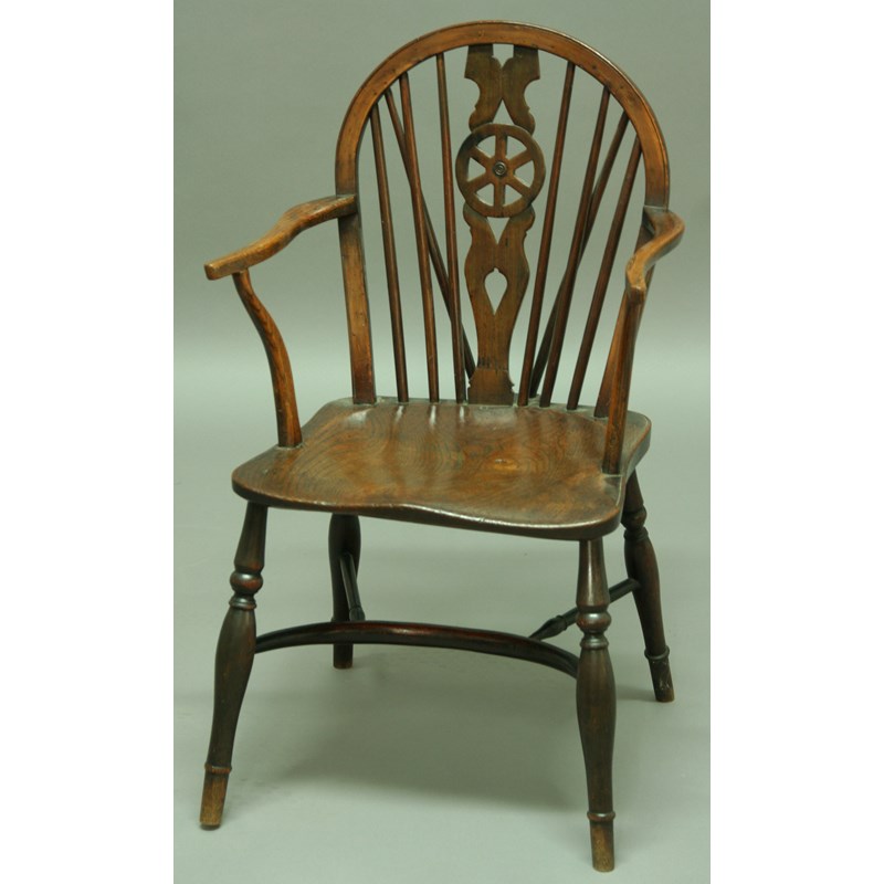 AN ASH AND ELM WHEELBACK CHAIR, later 19th century, with pierced back splat, outswept arms, solid seat and crinoline stretcher