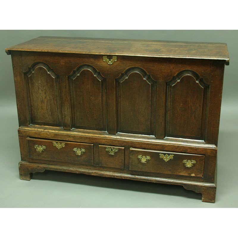 AN OAK DOWRY CHEST, late 17th century, with hinged cover, four arching panelled front above two short and a candle drawer, 97 x 143cm