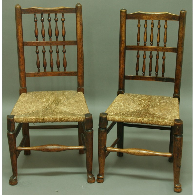 A MATCHED SET OF SEVEN LANCASHIRE DINING CHAIRS, bobbin turned backs above rush seats and turned stretchers (7)