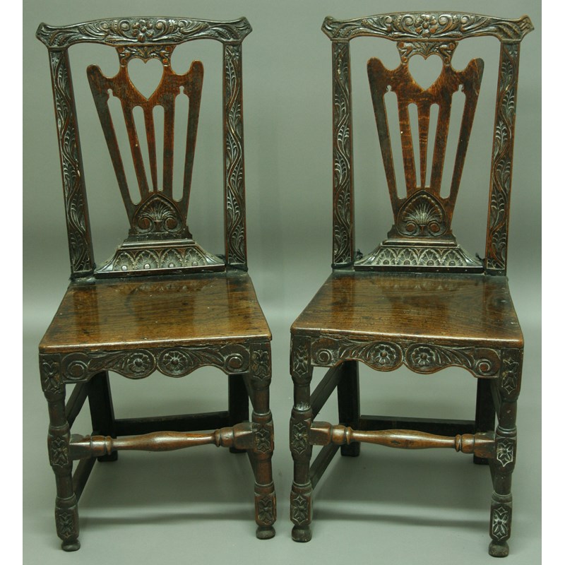 A SET OF SIX 18TH CENTURY OAK DINING CHAIRS with yoke top rail, pierced splat and solid seat, the whole with floral and foliate carving (6).