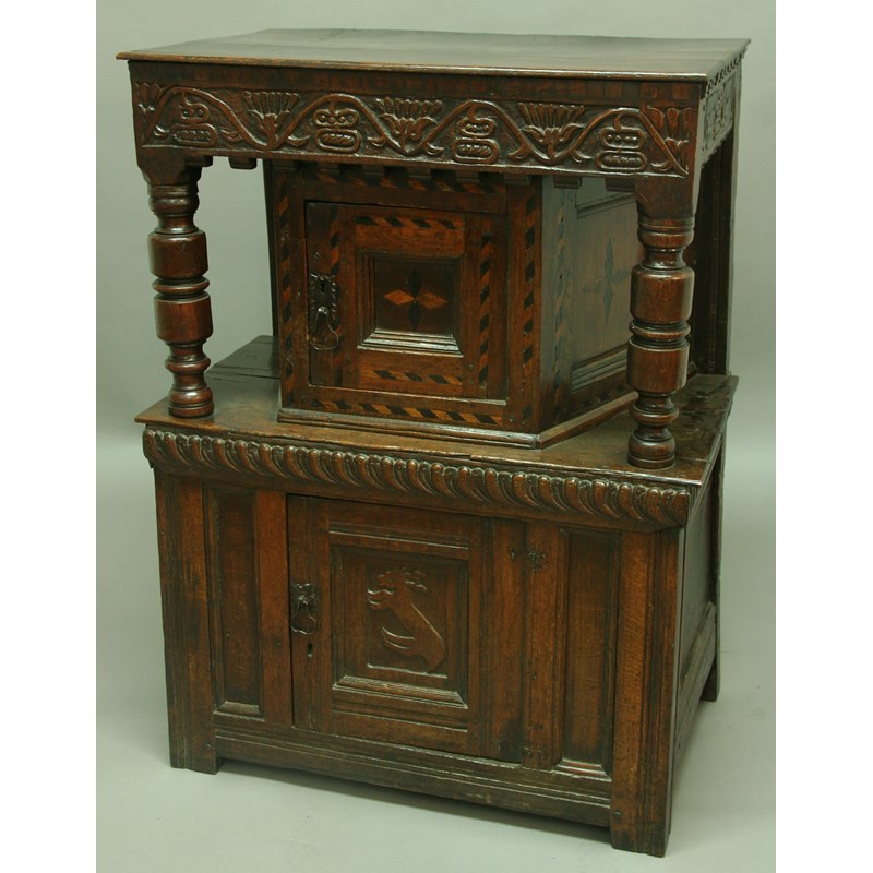 AN OAK AND INLAID COURT CUPBOARD,