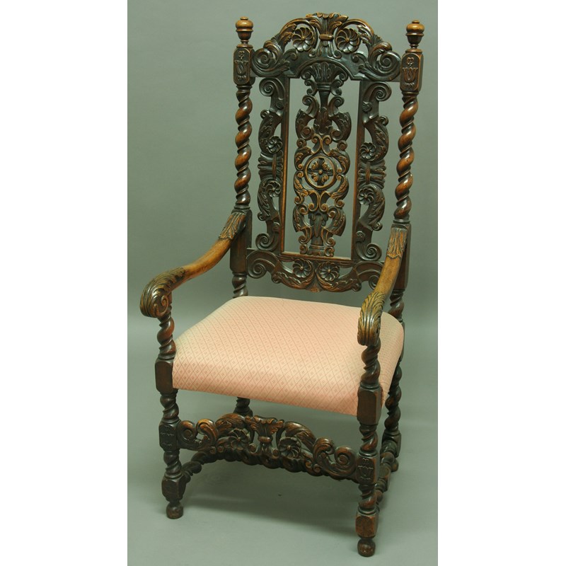 A CAROLEAN STYLE WALNUT OPEN ARM CHAIR, with foliate pierced back on barleytwist supports, stuffed over seat, pierced rail and barleytwist H stretcher