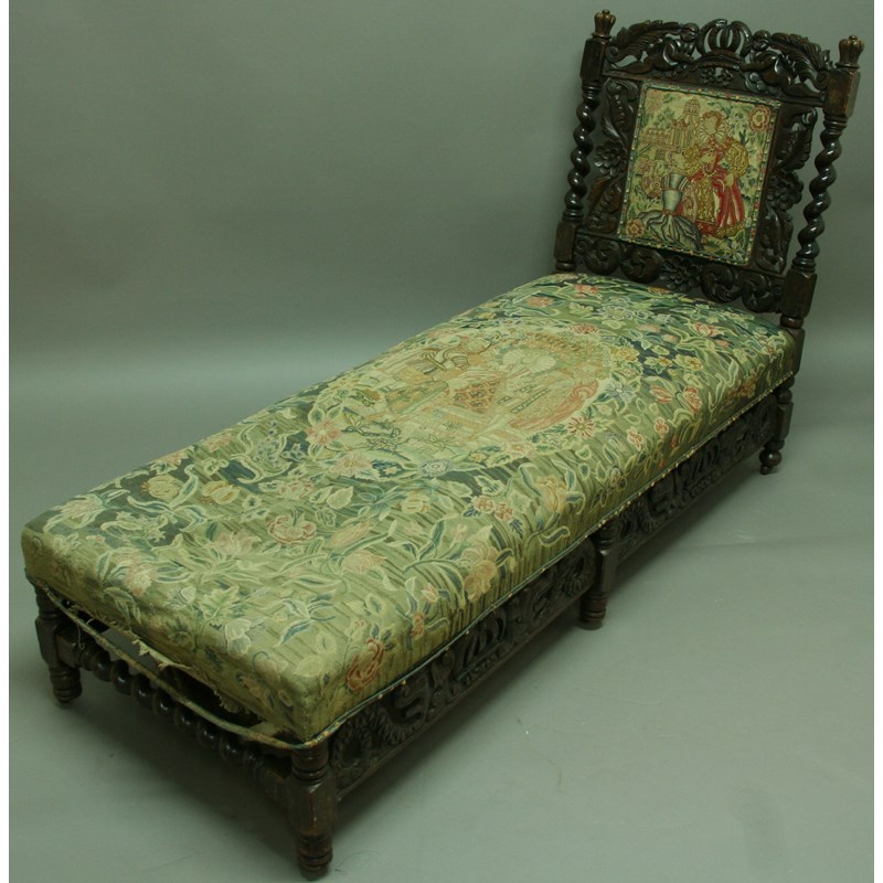CAROLEAN STYLE OAK FRAMED DAY BED the backrest carved with crown, angels and flowers with tapestry backrest and bed cover, 178cm.