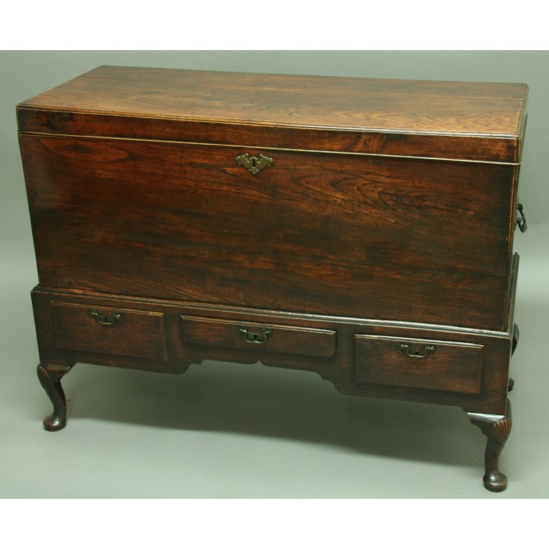 AN 18TH CENTURY CHESTNUT MULE CHEST ON STAND