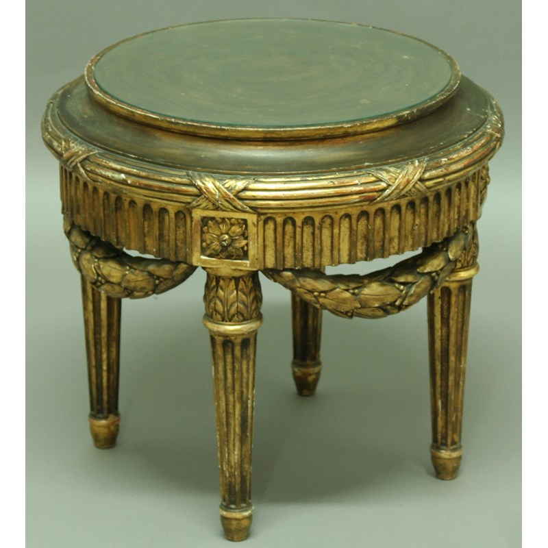 A GILTWOOD OCCASIONAL TABLE OR STAND, of circular form, with neo-classical fluting, swags and tapering legs, 60cm diameter