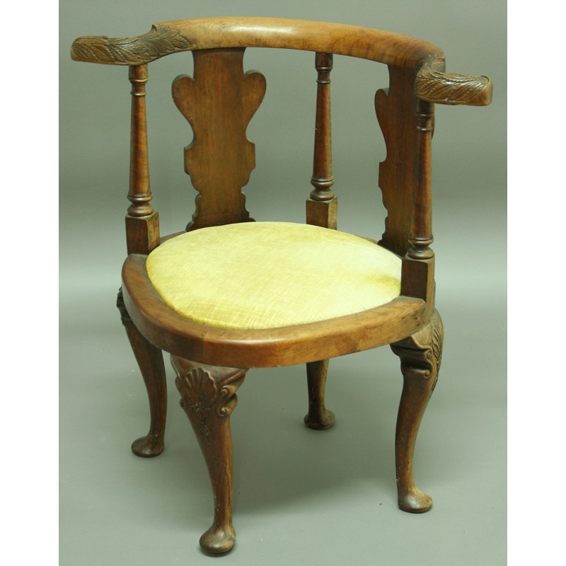A GEORGE III STYLE MAHOGANY CORNER CHAIR with foliate carved out-swept top rail, pair of splats, oval dropping seat and shell carved cabriole legs.