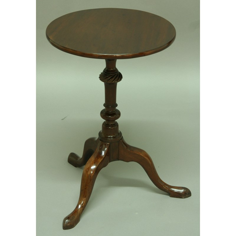 A GEORGE III STYLE MAHOGANY WINE TABLE, the circular top above a turned column and tripod base, height 58cm