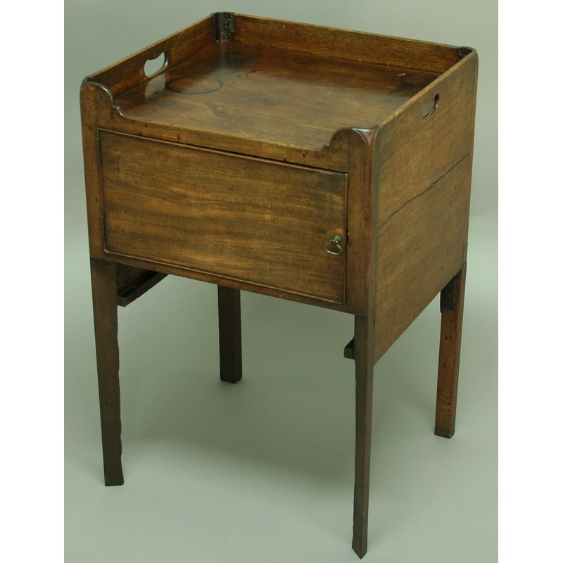 A GEORGE III MAHOGANY TRAY TOP COMMODE with single door to the front. 75cm x 50.5cm.