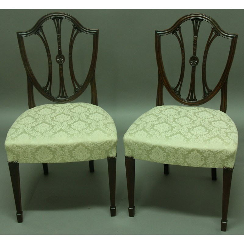 A SET OF SIX HEPPLEWHITE STYLE DINING CHAIRS, late 19th century, with pierced shield shaped backs over serpentine stuffed over seats (6)