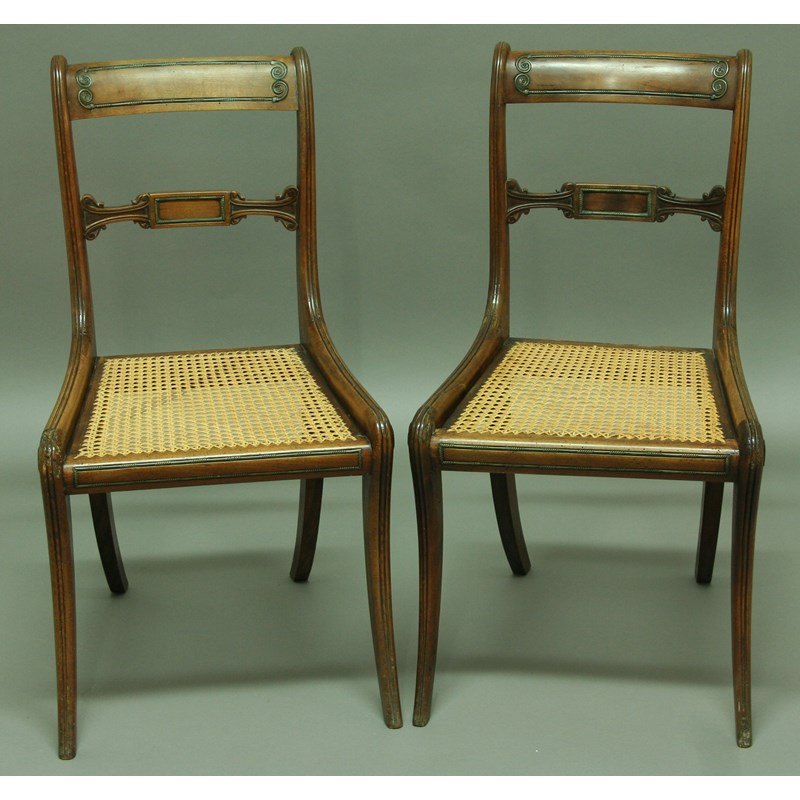 A SET OF SIX REGENCY ROSEWOOD EFFECT DINING CHAIRS, with carved top rail and back rest, caned seat and sabre legs with brass flowerhead highlights (6)