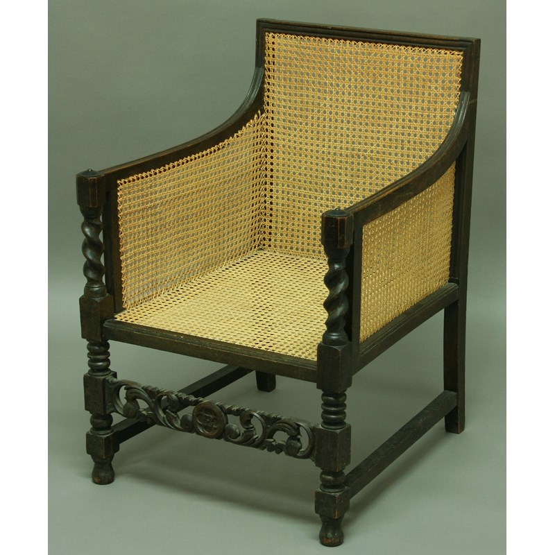 A BERGERE CHAIR, with single caned back, arms and seat and pierced front rail