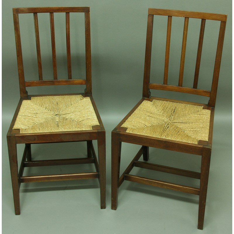 A PAIR OF MAHOGANY EDWARD VII CORONATION CHAIRS with rush seats, stamped ER VII CORONATION to the back rail.