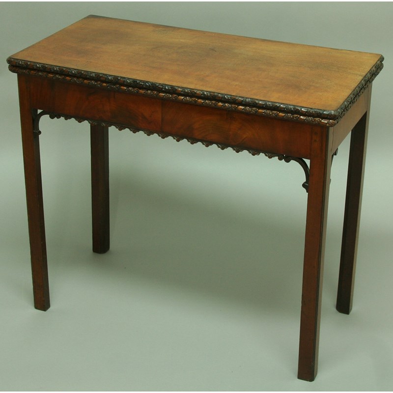 A GEORGE III MAHOGANY CARD TABLE with floral carved rims and arching apron. height 74cm x width 83.5cm.