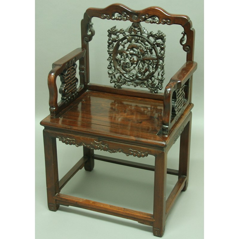 A CHINESE HARDWOOD THRONE CHAIR, the back rest carved with beasts around a central mon, solid seat and square section legs