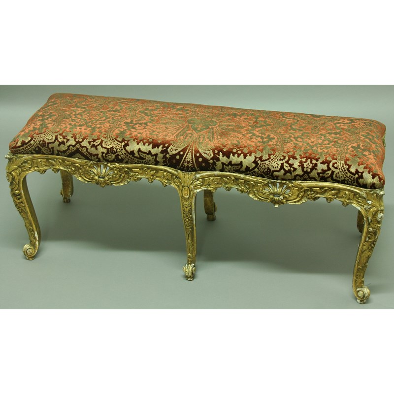 A FRENCH WINDOW SEAT, 19th century, of shaped rectangular outine, with pierced, carved and gilded apron and cabriole legs, 110cm