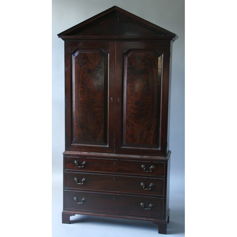 19th century, with architectural pediment above a pair of fielded panelled doors enclosing adjustable shelving, on a base with three cockbeaded graduated long drawers, 195 x 96cm