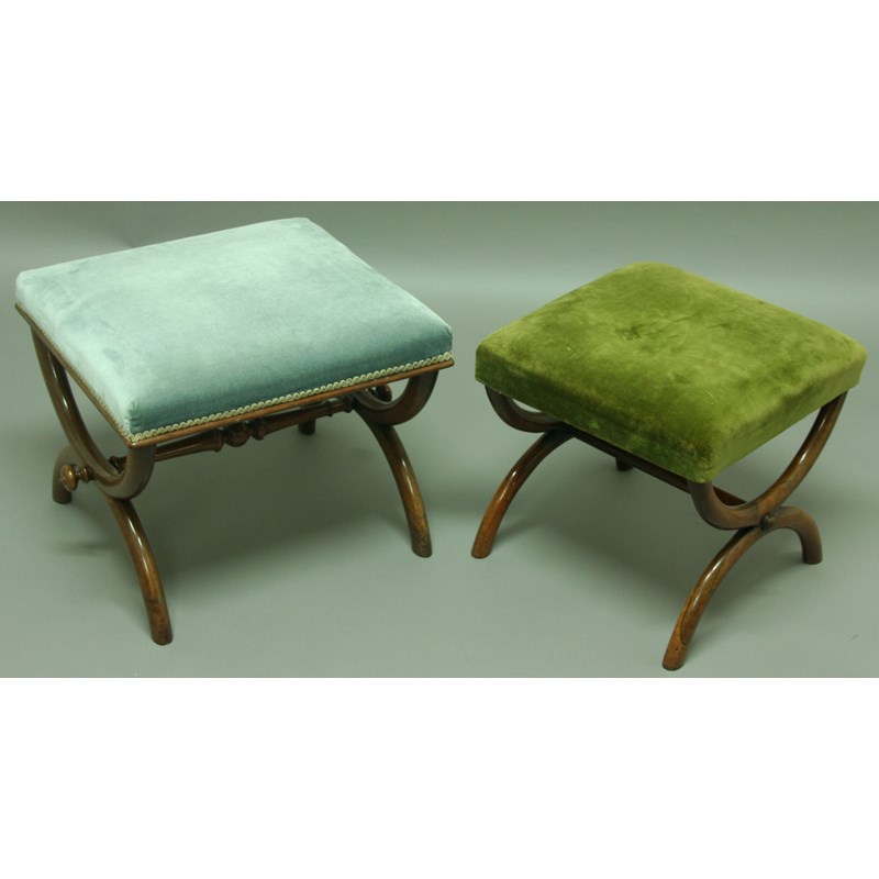 TWO ROSEWOOD 'X' FRAME STOOLS, circa 1830, with rectangular upholstered seats, the larger with turned stretcher, widths 54 and 4cm (2)