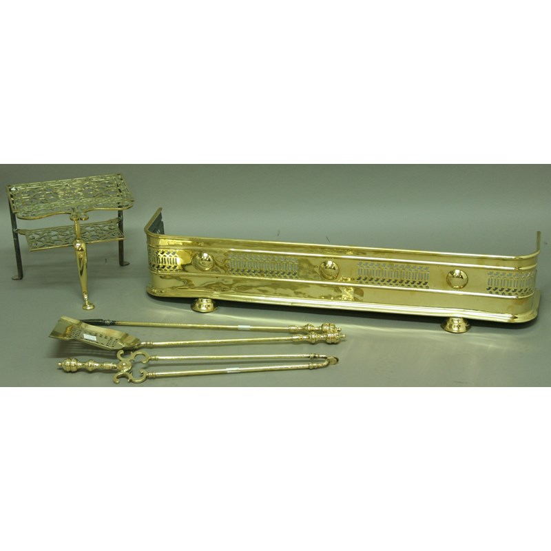 A BRASS FENDER late 19th century, with pierced decoration, together with a two-tier brass trivet and a three-piece set of fire irons (5).