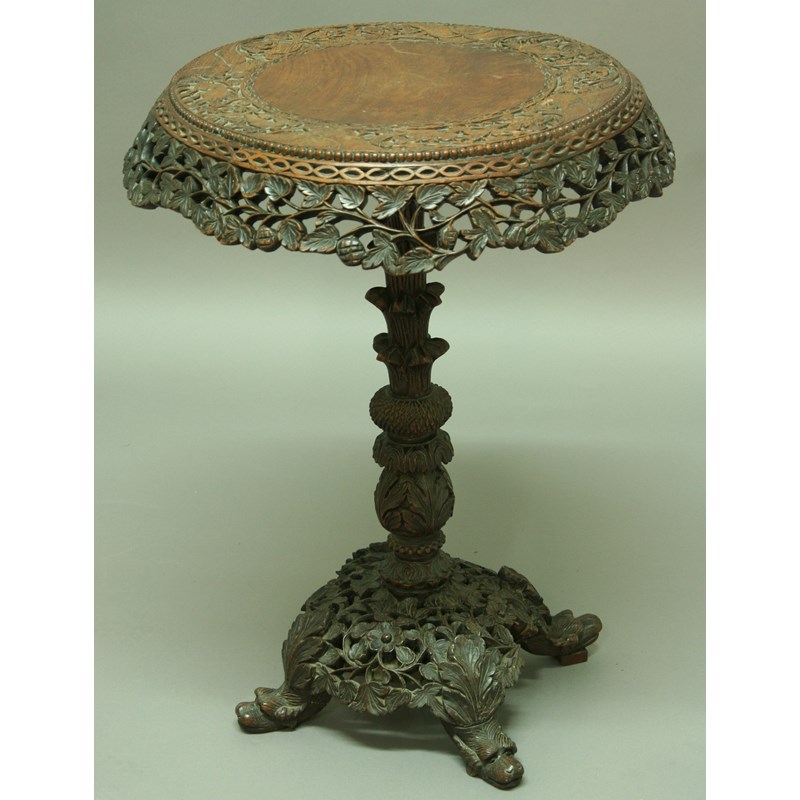 late 19th century, the circular top with scrolling bird and foliate carving above a pierced apron, carved column and pierced base with animal head feet, height 78cm