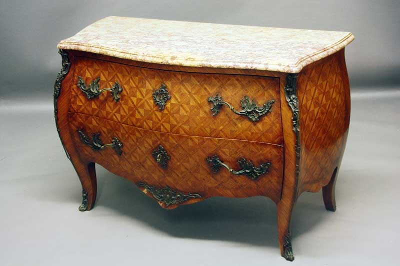 A COMMODE of Louis XV design with serpentine bombe front and sides, the whole veneered with kingwood parquetry, marble top, 123cm