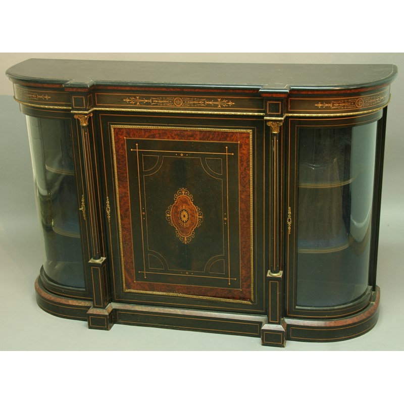 A VICTORIAN EBONISED AND AMBOYNA INLAID CREDENZA, with a central door flanked by a pair of bowed, glazed doors, 102 x 152cm