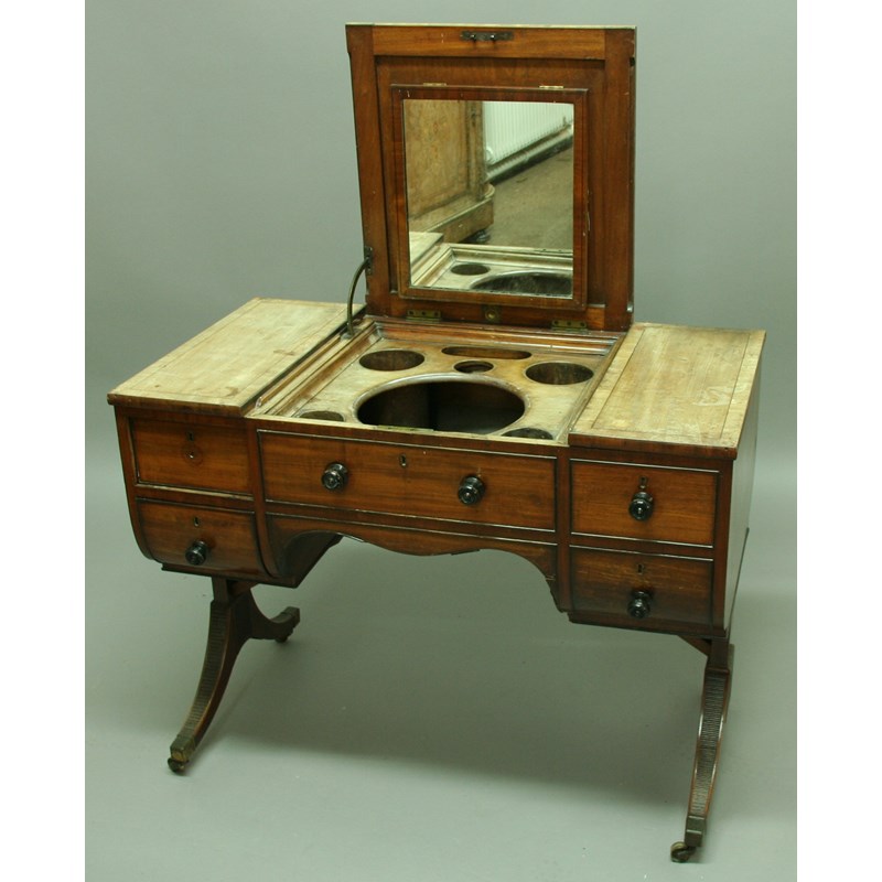 A REGENCY MAHOGANY DRESSING TABLE the top lifting to reveal a mirrored washstand and further fitted compartments on a barrel-shaped body with an arrangement of drawers on outswept legs. Height 79cm x width 103cm.