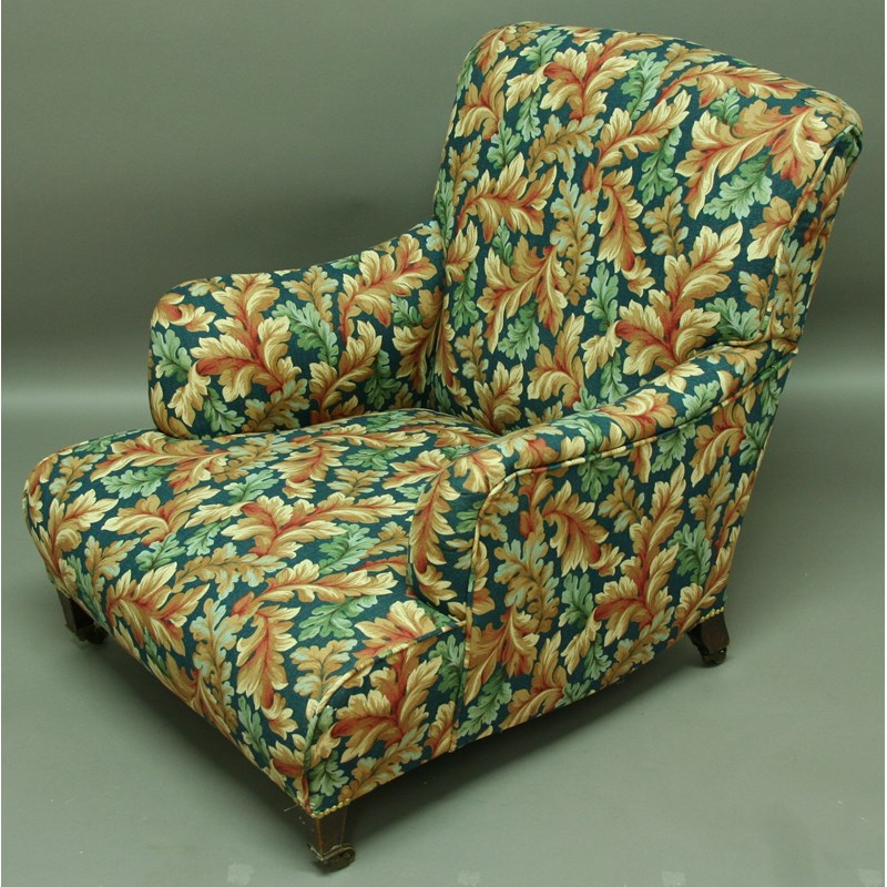 A HOWARD & SONS ARMCHAIR rear leg stamped 6322 4057 Howard & Sons Ltd, Bermers St. Brass castors also stamped Howard & Sons, London.