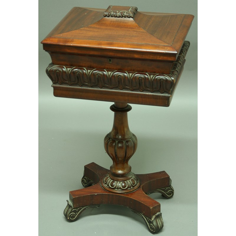 AN EARLY 19TH CENTURY MAHOGANY TEAPOY of sarcophagus form, the hinged cover enclosing four lidded tea canisters and spaces for two mixing bowls on a baluster column and quatrepartite foot. Height 82cm.