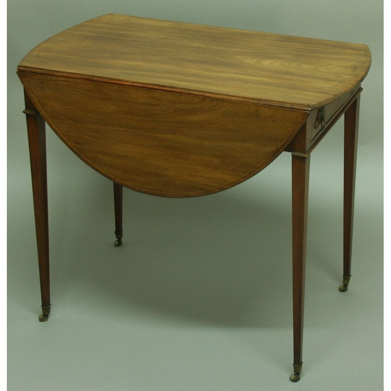 A GEORGE III MAHOGANY PEMBROKE TABLE with oval top and boxwood line inlay and single drawer. height 72cm x max. width 100cm.