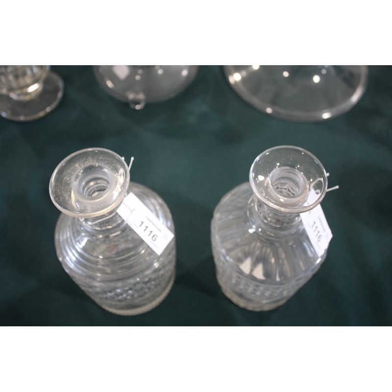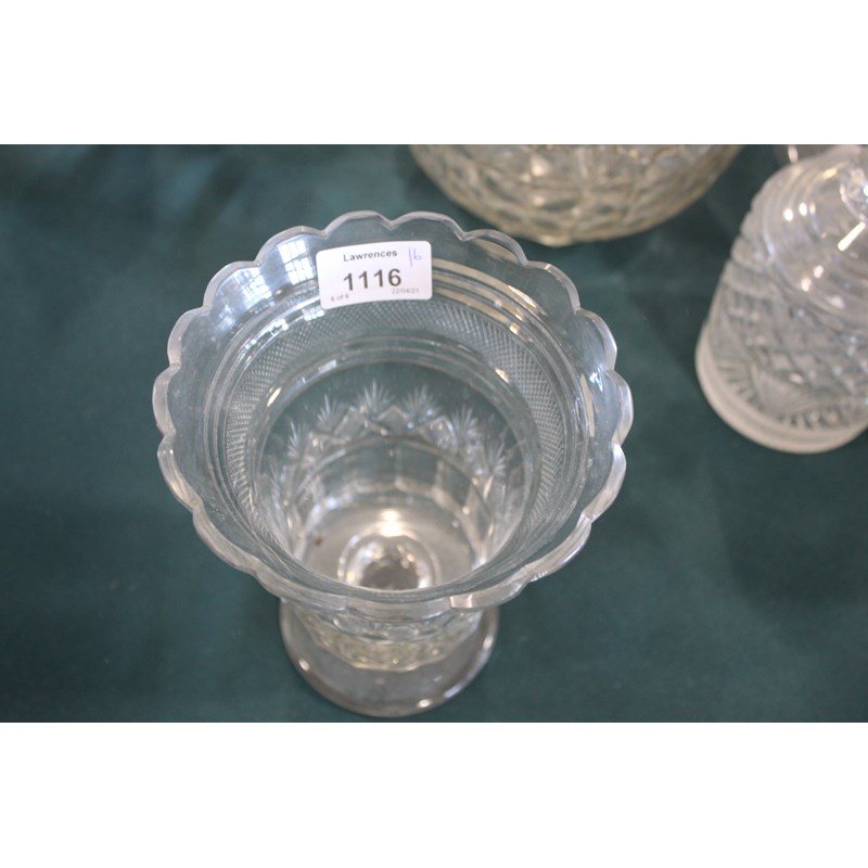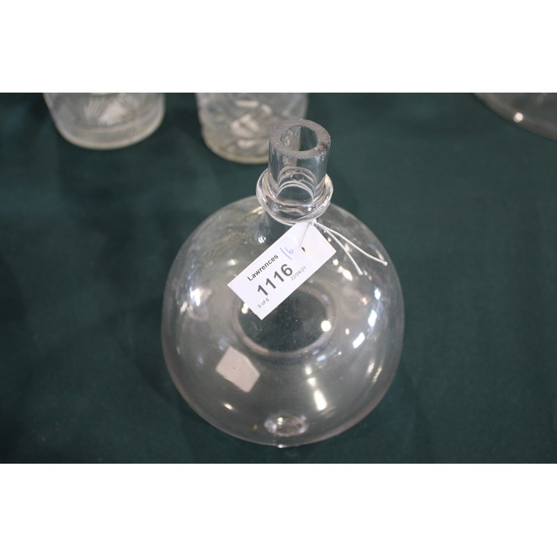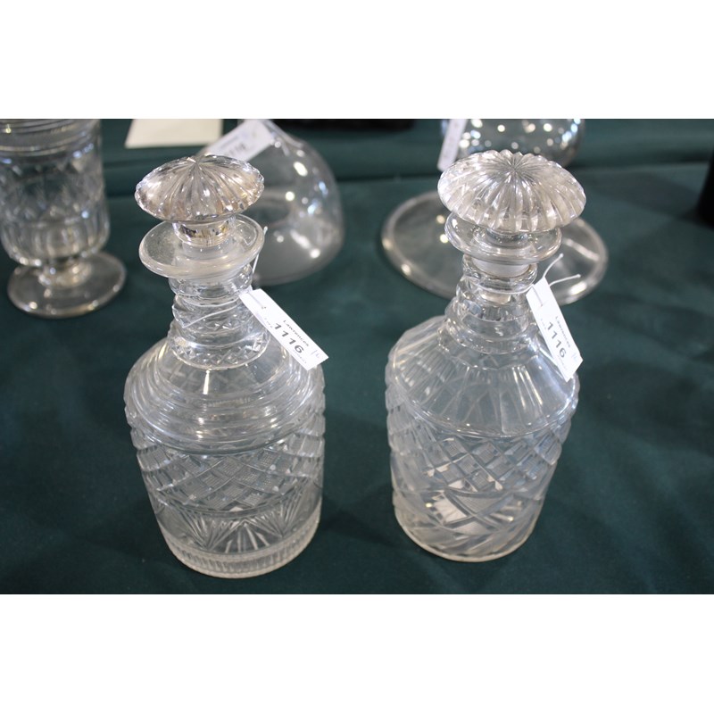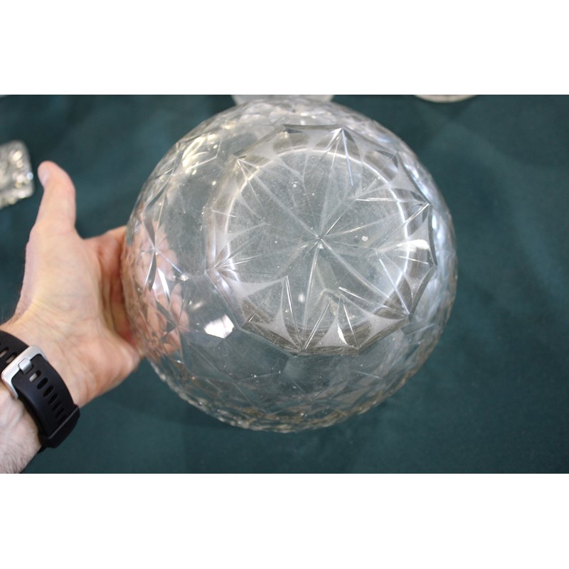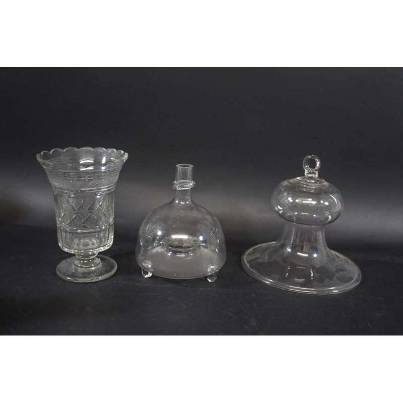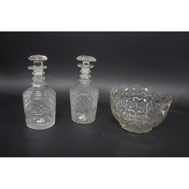 with a flared rim, the body with diamond cut decoration and faceted near the base (20cms high). Also with a glass wasp catcher, a bell shaped glass shade, two Georgian decanters, and a glass bowl. (6)