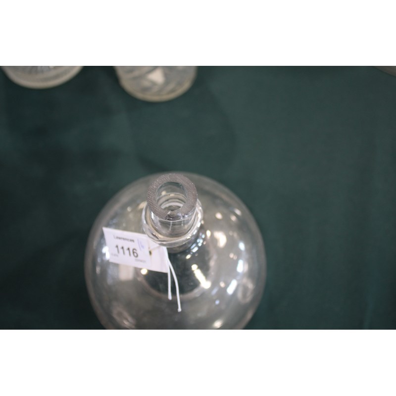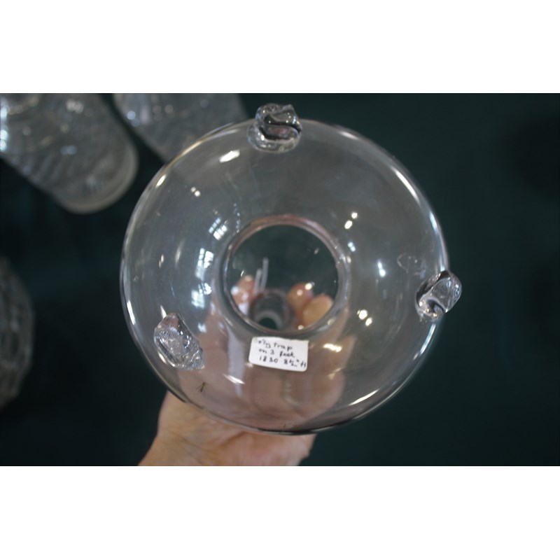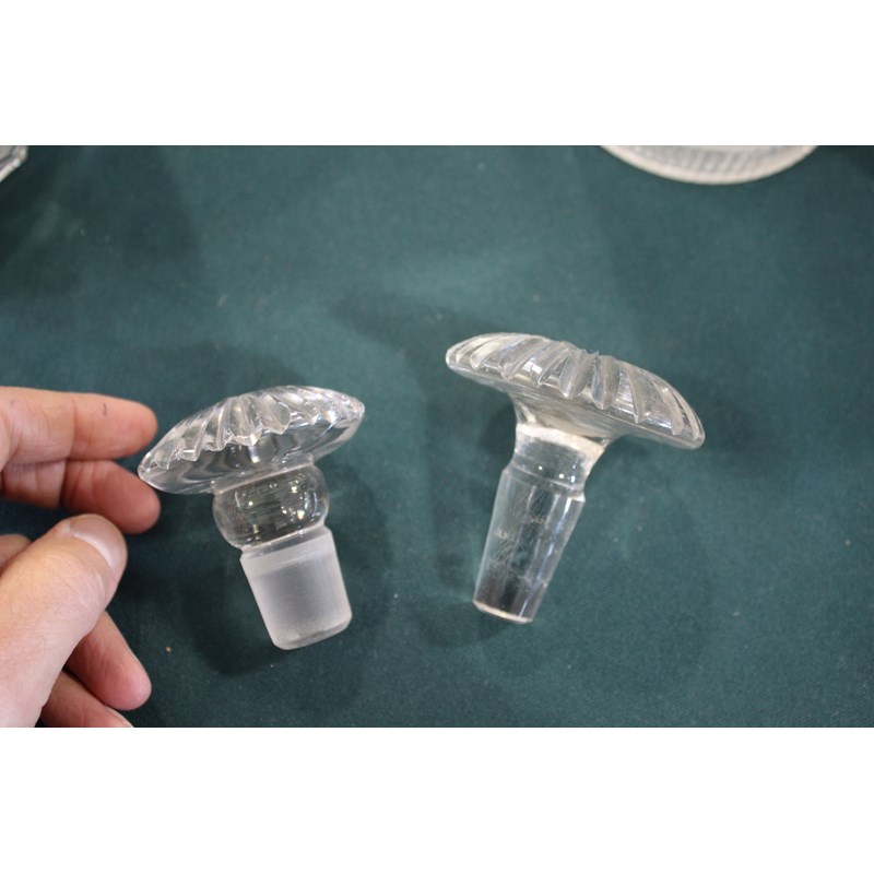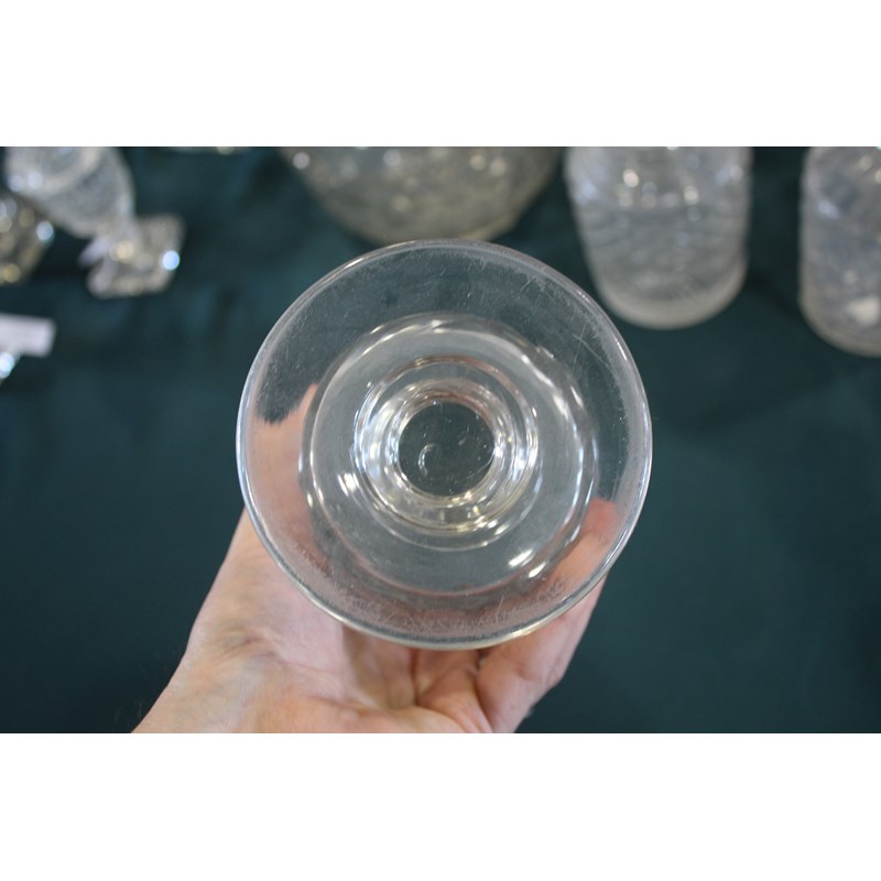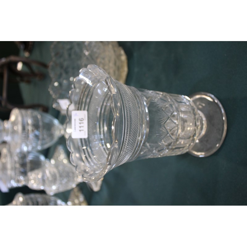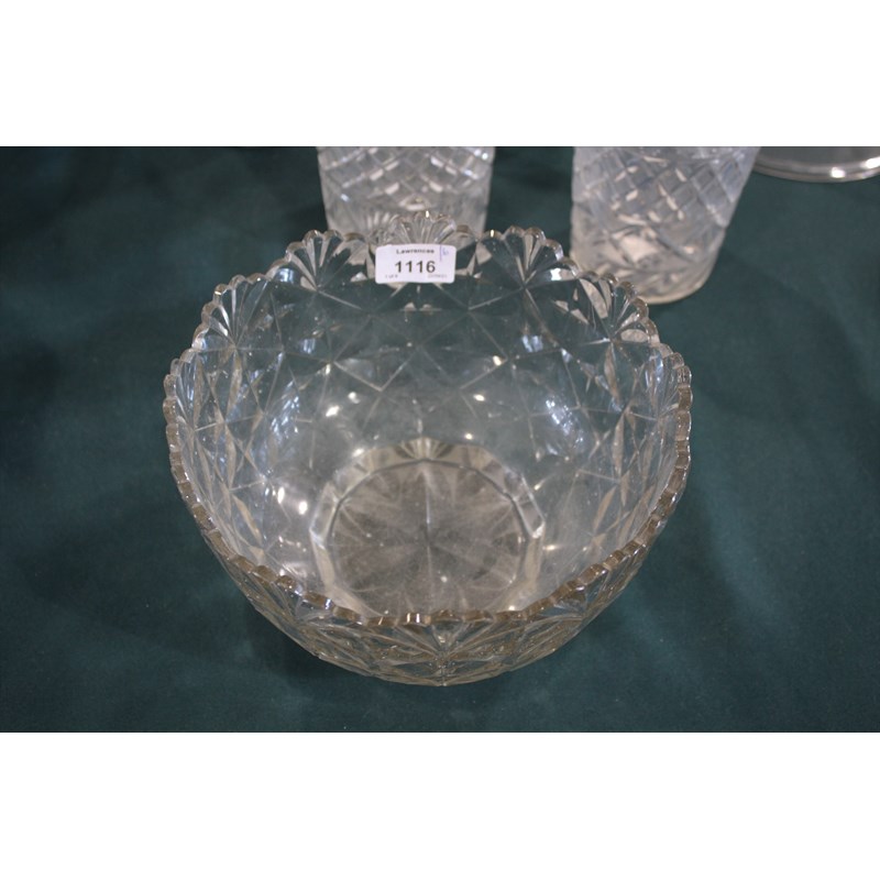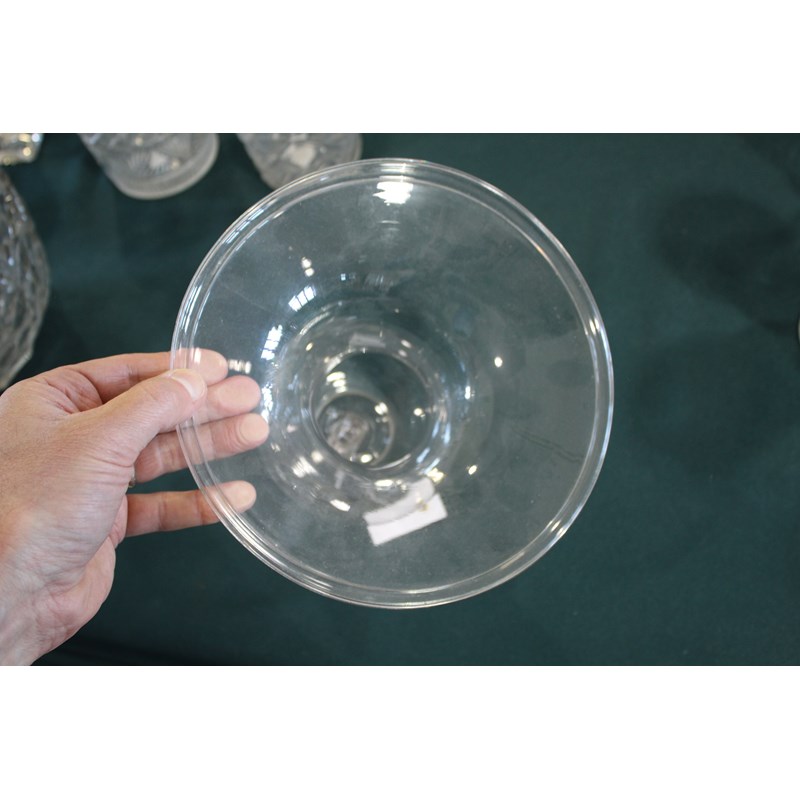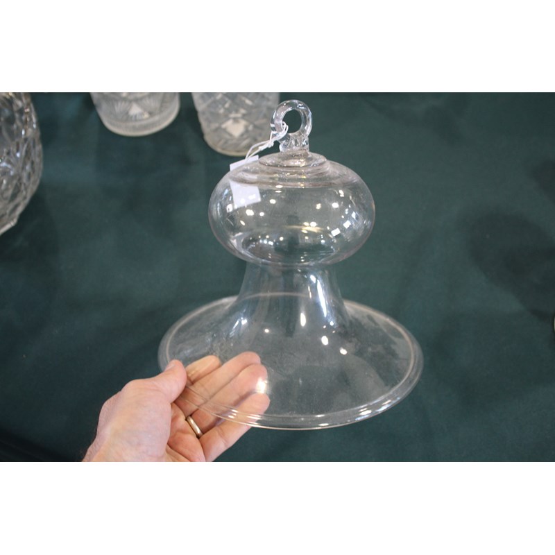 with a flared rim, the body with diamond cut decoration and faceted near the base (20cms high). Also with a glass wasp catcher, a bell shaped glass shade, two Georgian decanters, and a glass bowl. (6)