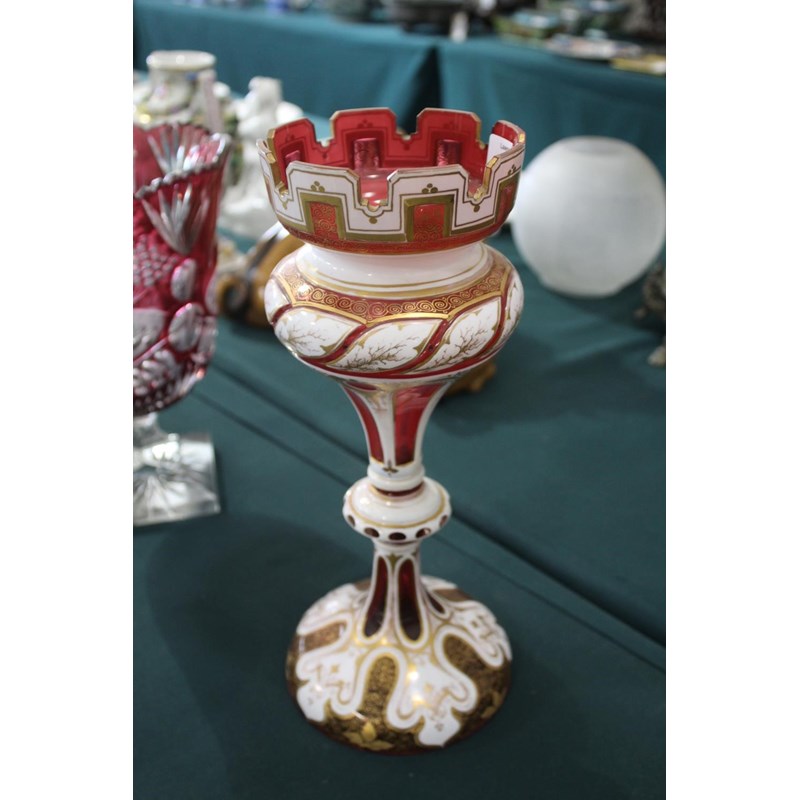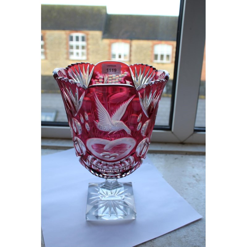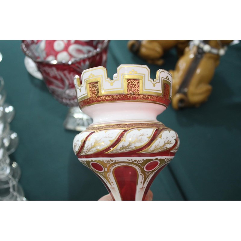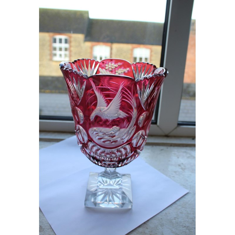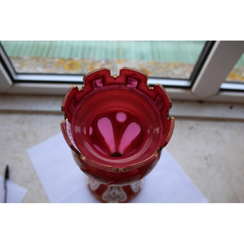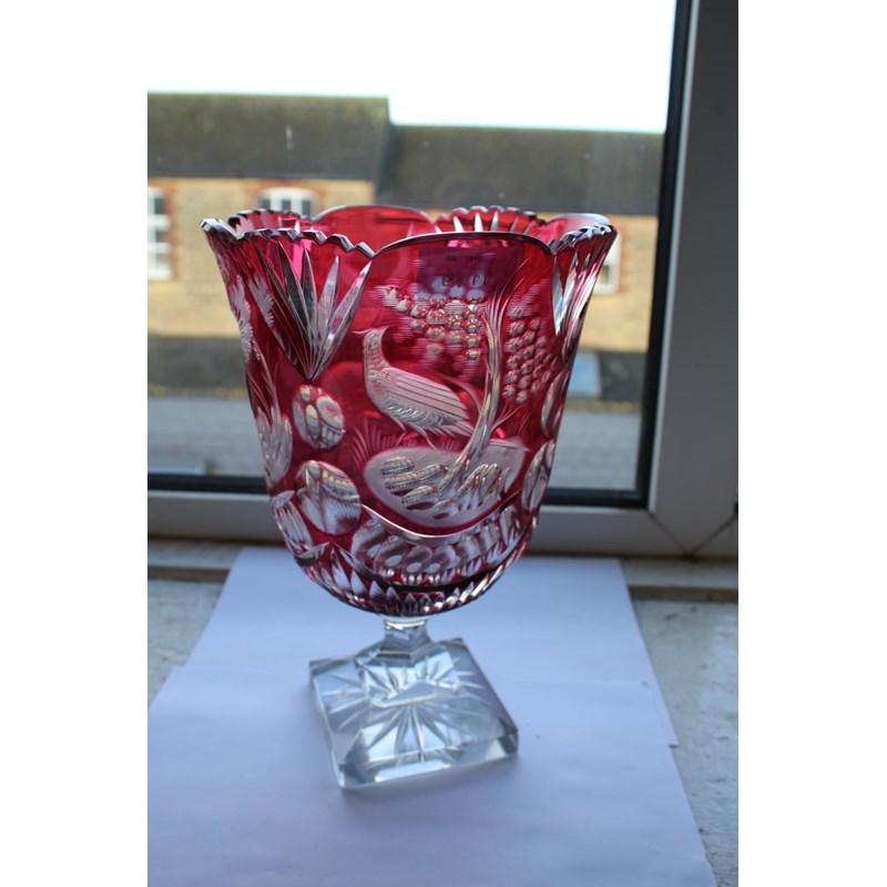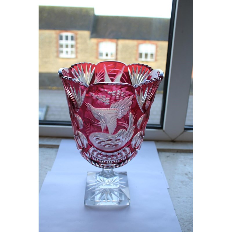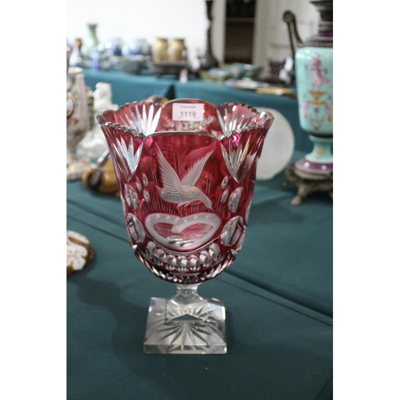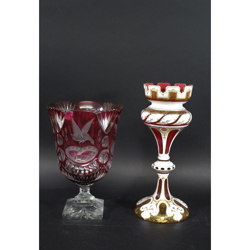 a large ruby flash cut glass vase, the bowl with various Birds and mounted on a square pedestal with star cut base (28cms high). Also with a Bohemian red and white overlaid glass vase, missing its glass lustres (33.5cms high). (2)